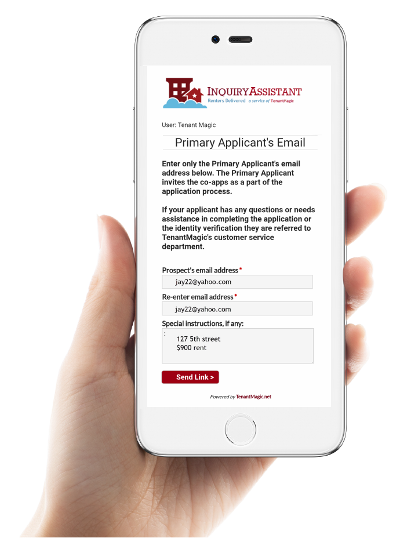 Enter the Primary Applicant's email address. They are linked to the complete their portions of their application and invite any co-applicants. When all are done, you are immediately notified and linked to the completed application and all of the credit, criminal background and eviction information and reports. TenantMagic provides live customer service to interact with prospects should they have questions or difficulty completing the application or verifying their identity. Both InquiryAssistant and TenantMagic are free for agents, landlords and property managers.